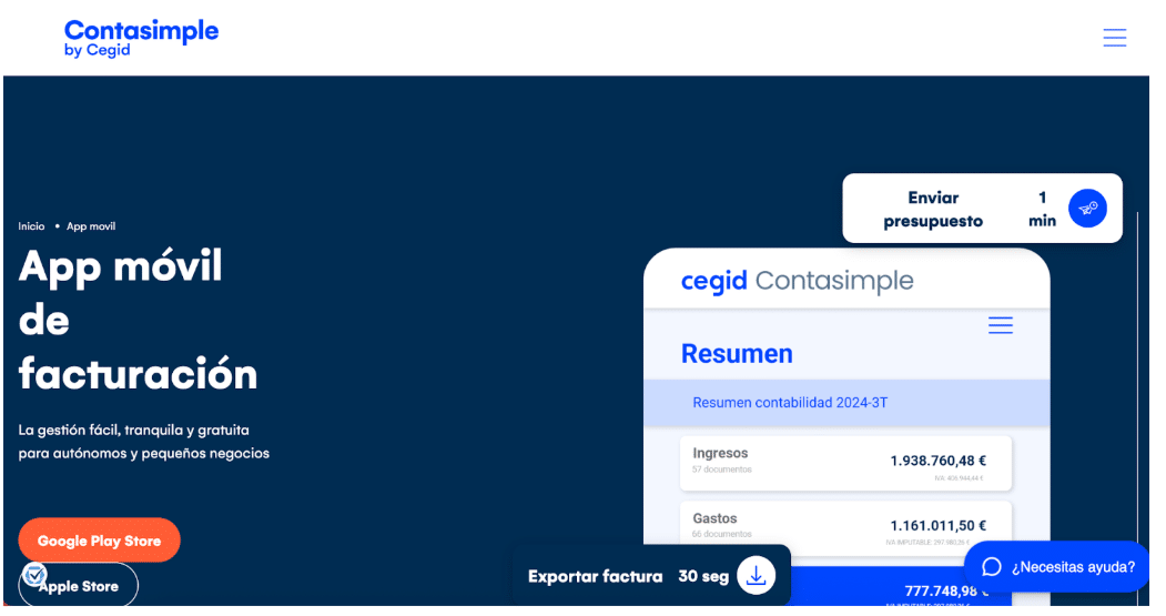 Contasimple es un programa de facturación en la nube que combina facturación, contabilidad e impuestos en una sola plataforma, pensado especialmente para autónomos y pequeñas empresas que buscan simplicidad sin renunciar al control administrativo.
