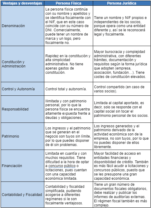 Vistas las ventajas y desventajas de ser persona física vs. persona jurídica, queda claro que lo más conveniente es comenzar la actividad como empresario individual (persona física) por aquello de la rapidez, simplicidad y ahorro de costes. No obstante, conforme va progresando tu negocio, puede que llegue el momento en el que te plantees la posibilidad de dar el salto a constituirte en sociedad (persona jurídica) porque te resulta mucho más ventajoso en diferentes aspectos, como las posibilidades de crecimiento de tu negocio, el tema de la responsabilidad civil, la protección de tu patrimonio, la fiscalidad y el pago de impuestos, el acceso a créditos, etc.