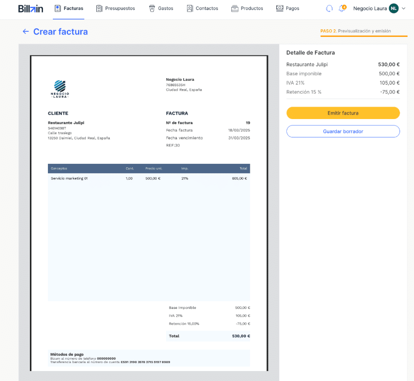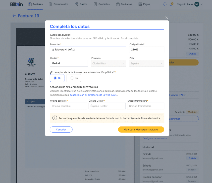 5. Solo falta que rellenes los datos del emisor de la factura y guardar.