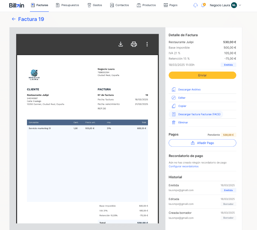 4. Puedes enviarla, descargarla, copiarla e incluso añadir pagos.