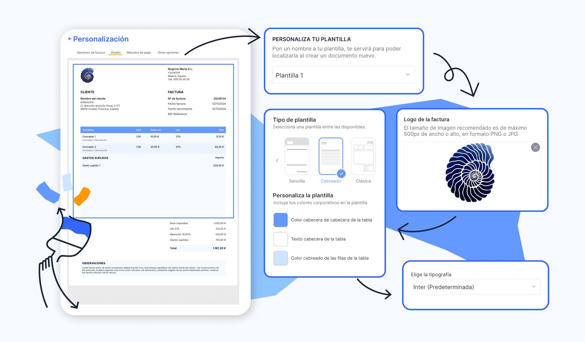 Elige el idioma, la plantilla que quieras, tu logotipo, tus colores corporativos y el tipo de fuente que necesites para hacer todas tus facturas.